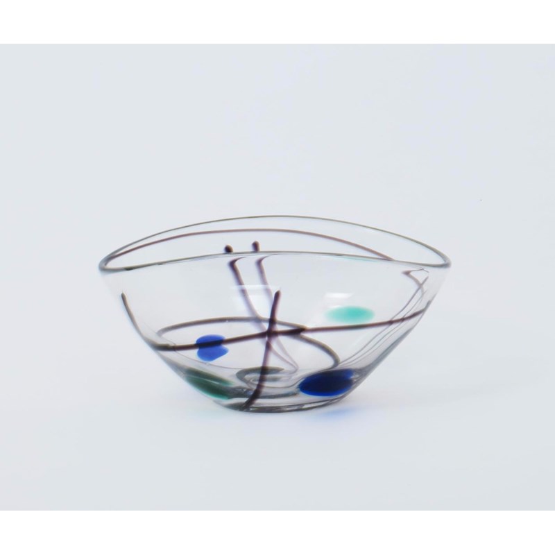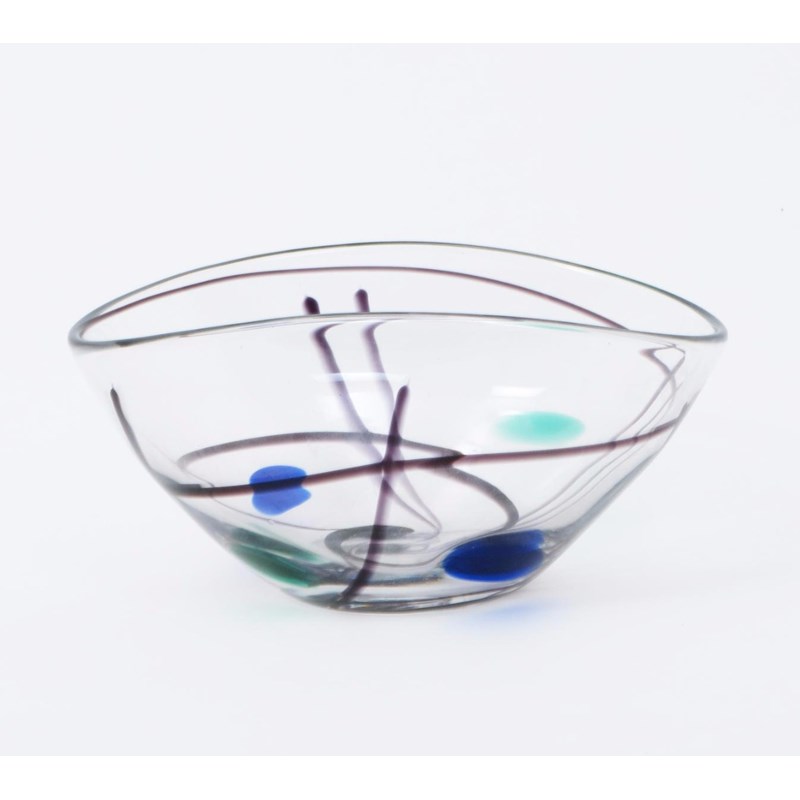 A Kosta Boda glass bowl, elliptical form, blue and turquoise spots with aubergine swirling lines, cased in clear etched Kosta mark 22cm. wide.
