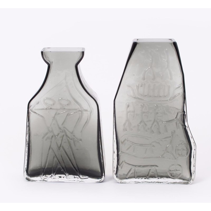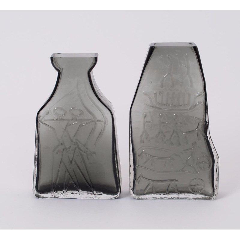 A Flygsfors smoky glass vase designed by Viktor Berndt, dated 1960, shouldered form modelled in low relief and polished with two archers firing longbows, and another Flygfors vase decorated with stylised cave painting figures and scenes etched mark, signature and date 23cm. high