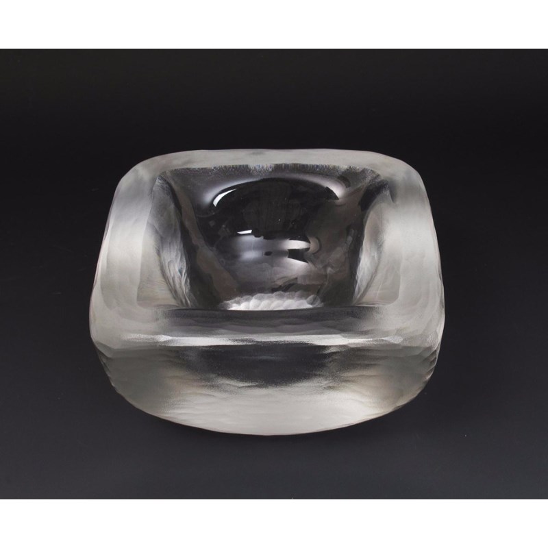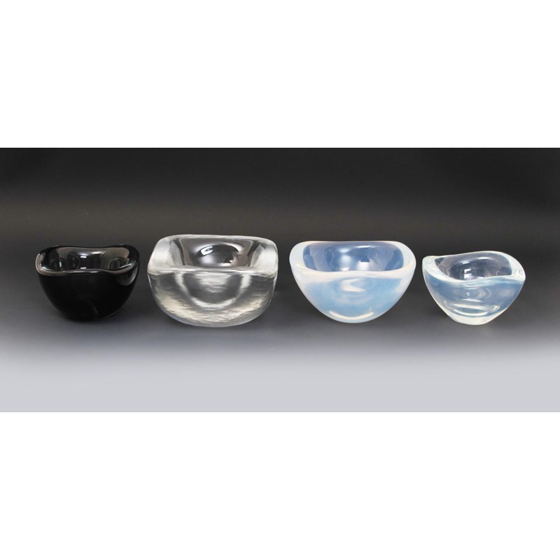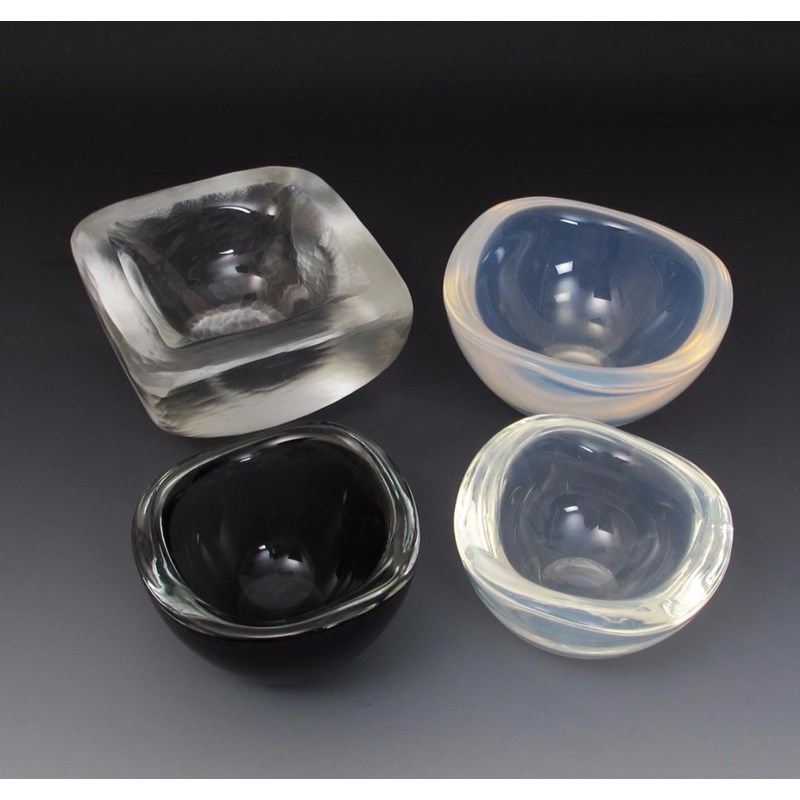 An Orrefors glass dish possibly by Vicki Lindstrand, square section the thick, heavy glass with martele hammered finish, two Orrefors opalescent glass dishes and an Orrefors smoked grey glass dish etched marks, 14cm. wide (4)