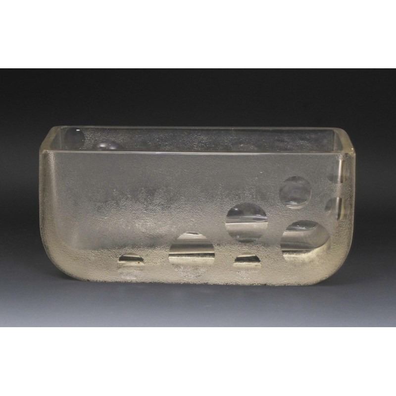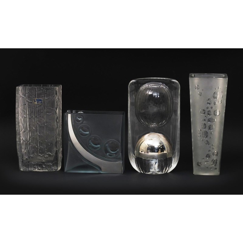 An Arch Taddei Sestini moulded glass vase, architectural form mounted with silver domed panel, and another silver mounted slab vase, a Spiegelau glass vase and two others, a Pukeberg glass serving platter and a frosted glass dessert service in the style of Iitala stamped marks, 22cm. high (13)