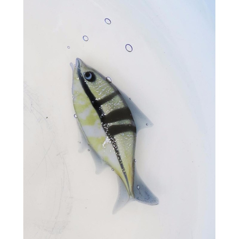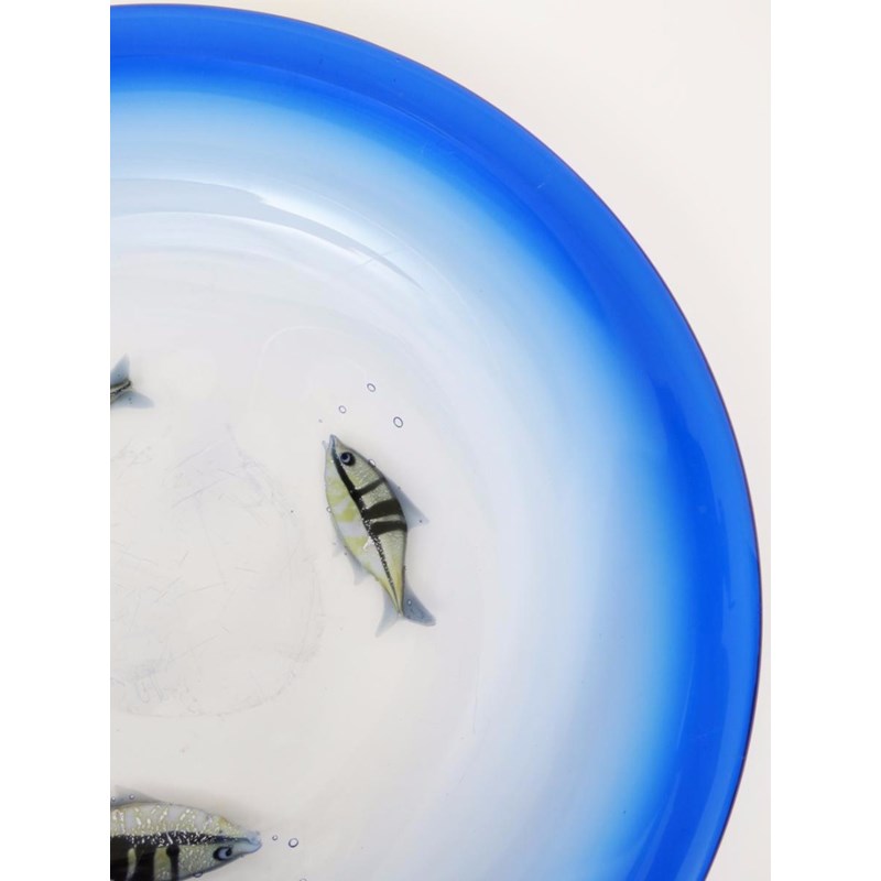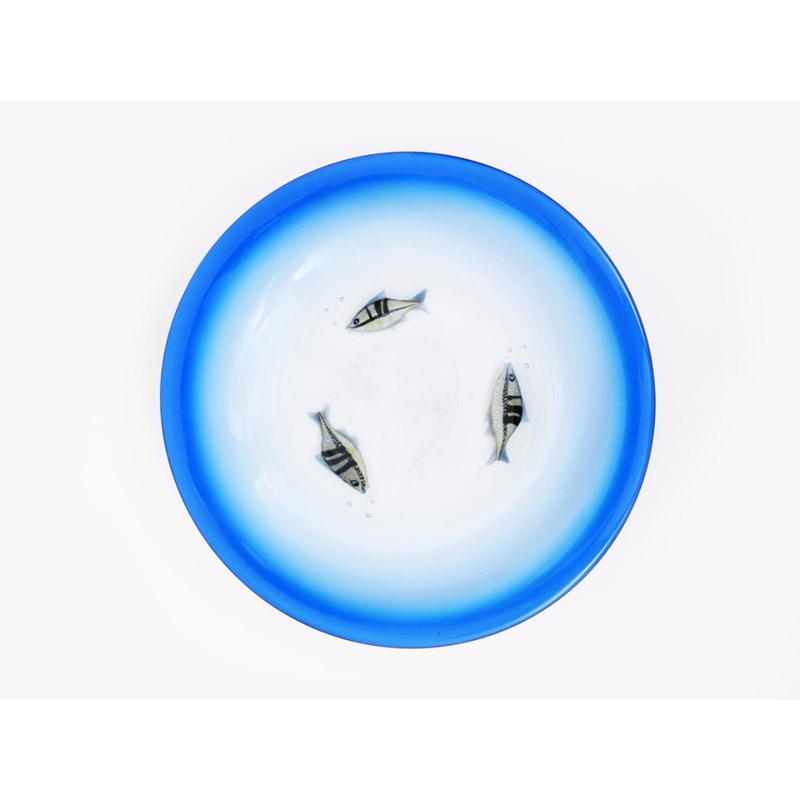 An Elio Raffaelli and Robert Camozzo large glass Aquarium charger, internally decorated with three swimming fish, with air bubbles, cased in clear glass graduating to a blue rim, etched Camozzo Raffaelli 45cm. diam.