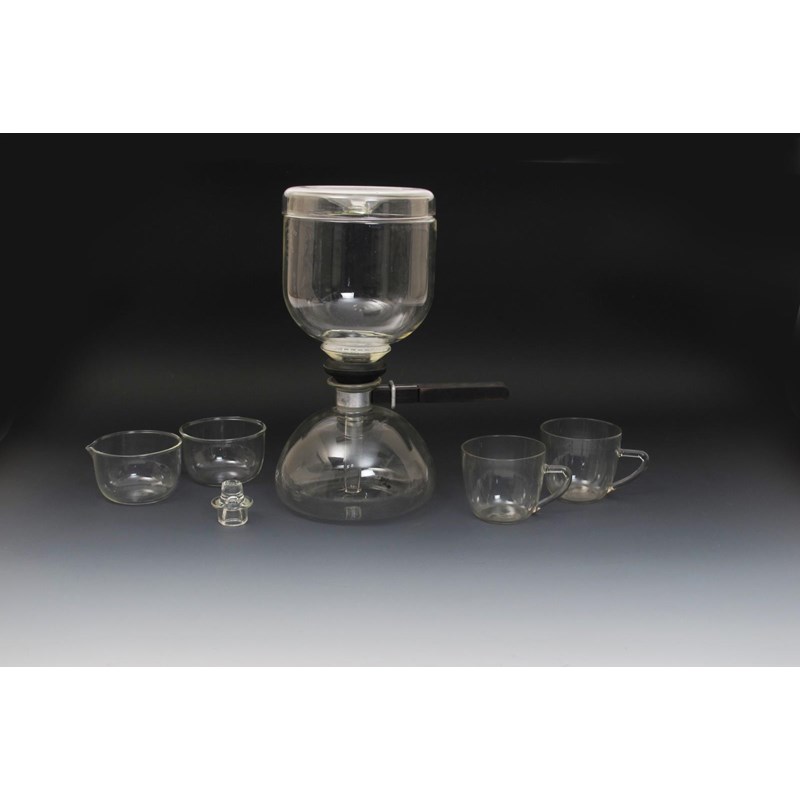 A Schott & Genossen Jenaer Glass Sintrax coffee pot, percolator and cover designed by Gerhard Marcks, with ebonised wood handle, with glass lid, a milk-jug and sugar basin and four cups, and a pair of Rosenthal Trulla wine-taster glasses designed by Michael Boehm in original box acid etched marks, 29.5cm. high