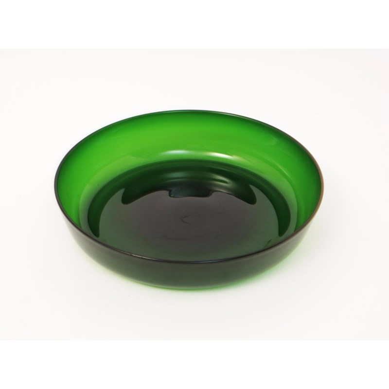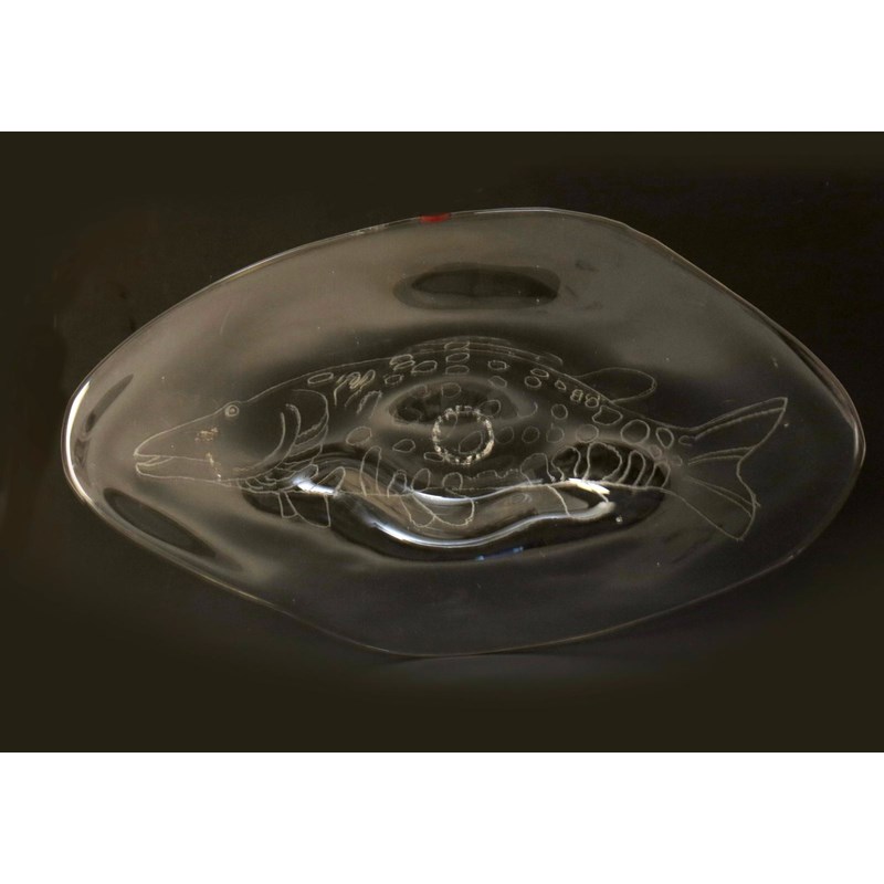 A large etched glass platter possibly by Inkeri Toikka, etched to the well with a large fish, a large, thick circular glass bowl with polished rim, a clear and black glass lazy susan and a large welled green glass bowl unsigned 50.5cm. wide (4)