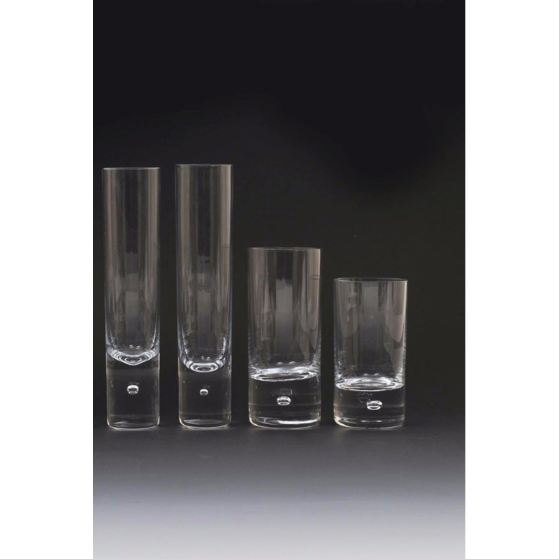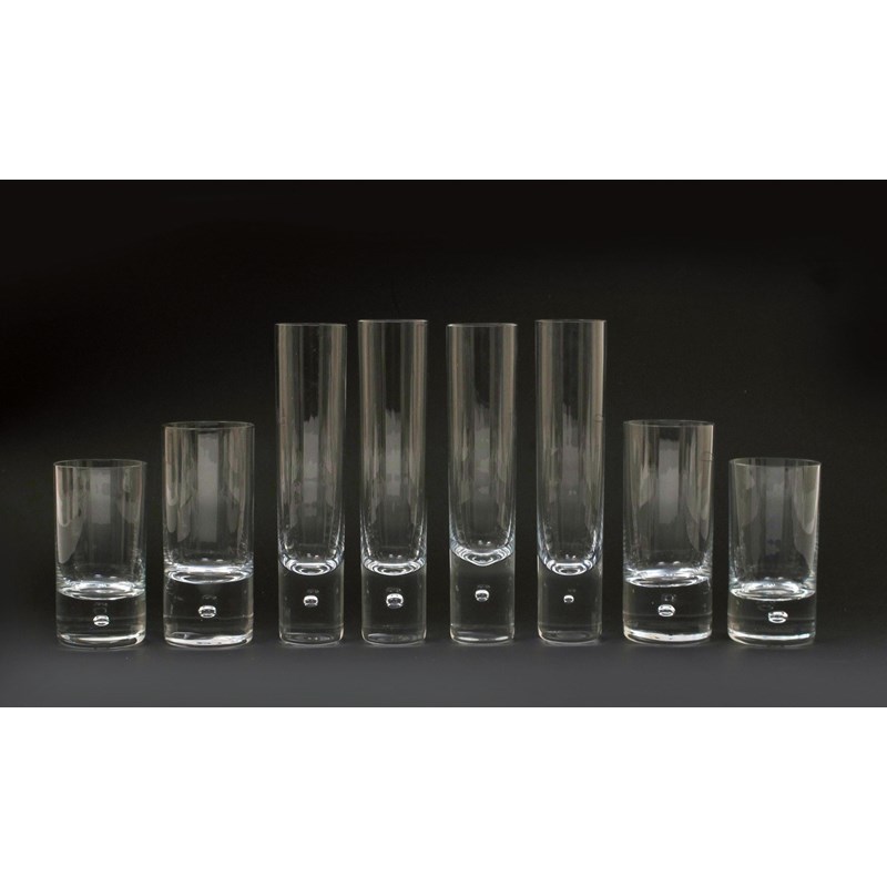 A collection of Kosta Boda Pippi glasses, comprising; six tall slender glasses, five shorter and eight small glasses, each with single air bubble in base acid etched marks, 19cm. high