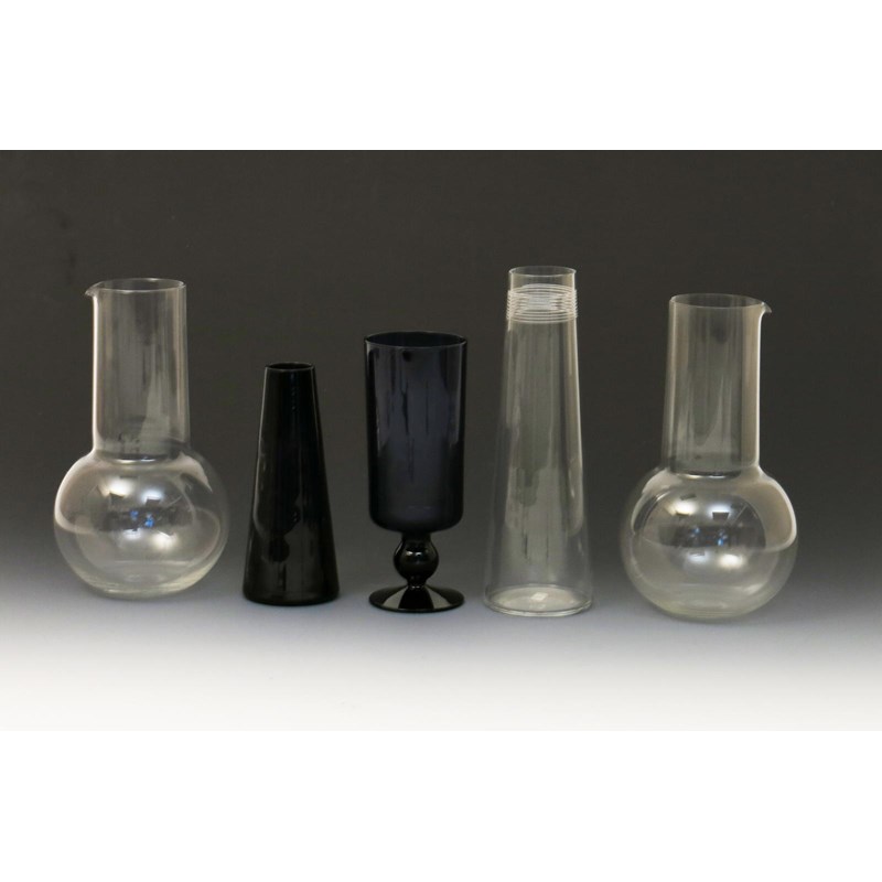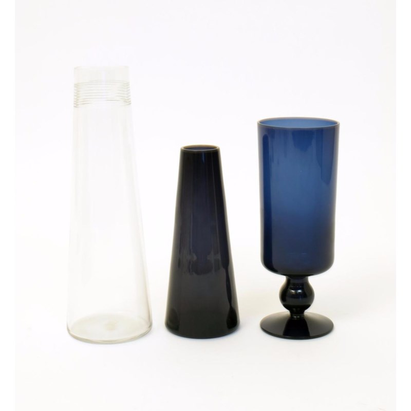 An early Nuutajarvi blue glass footed vase designed by Oiva Toikka, shape no.3407, produced between 1958 and 1966, a Nuutajarvi clear glass decanter designed by Kaj Franck and a clear glass vase with engraved bands designed by Saara Hopea and a collection of glass 19.5cm. high