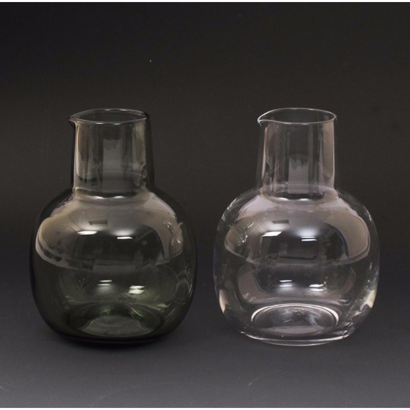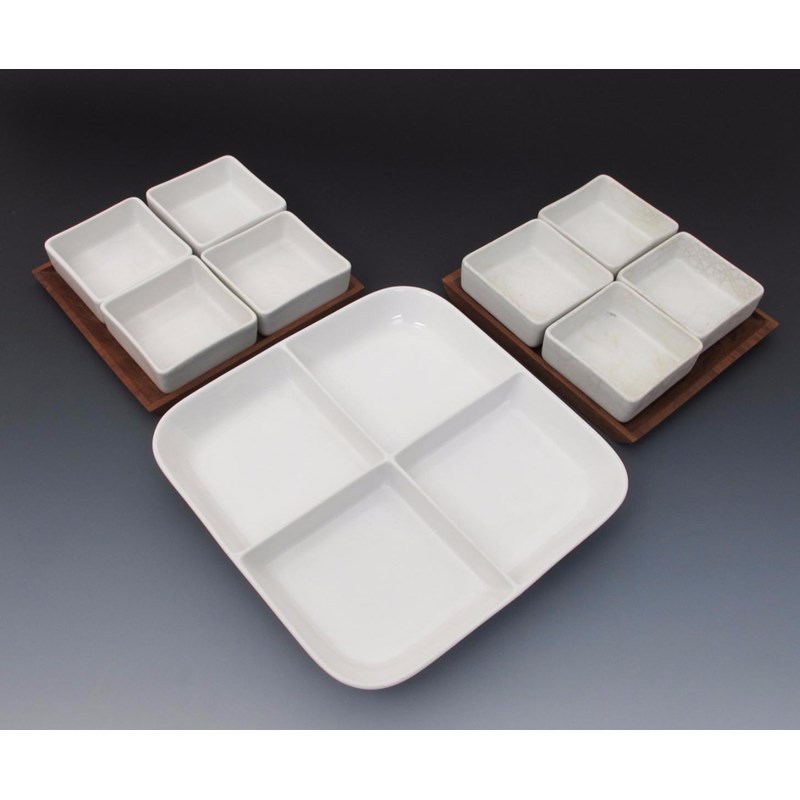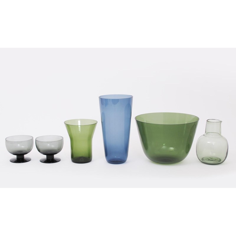 An Arabia pottery serving dish probably designed by Kaj Franck, square section, glazed green, a collection of Arabia serving dishes with teak trays, two glass water carafes, possibly Finnish and a collection of glass and ceramics including designs by Karina Aho unsigned 24cm. wide (a lot)