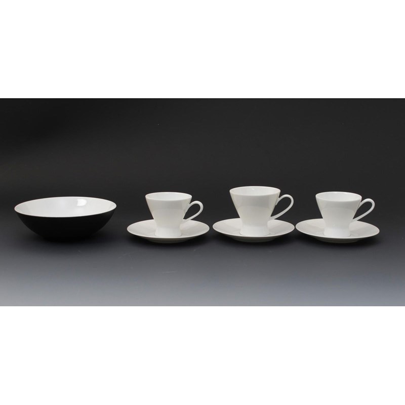 A Rosenthal porcelain Form 2000 coffee set designed by Raymond Loewy, comprising fifteen various cups and eleven saucers, and Four bowls and saucers also designed by Raymond Loewy printed marks and facsimile signature