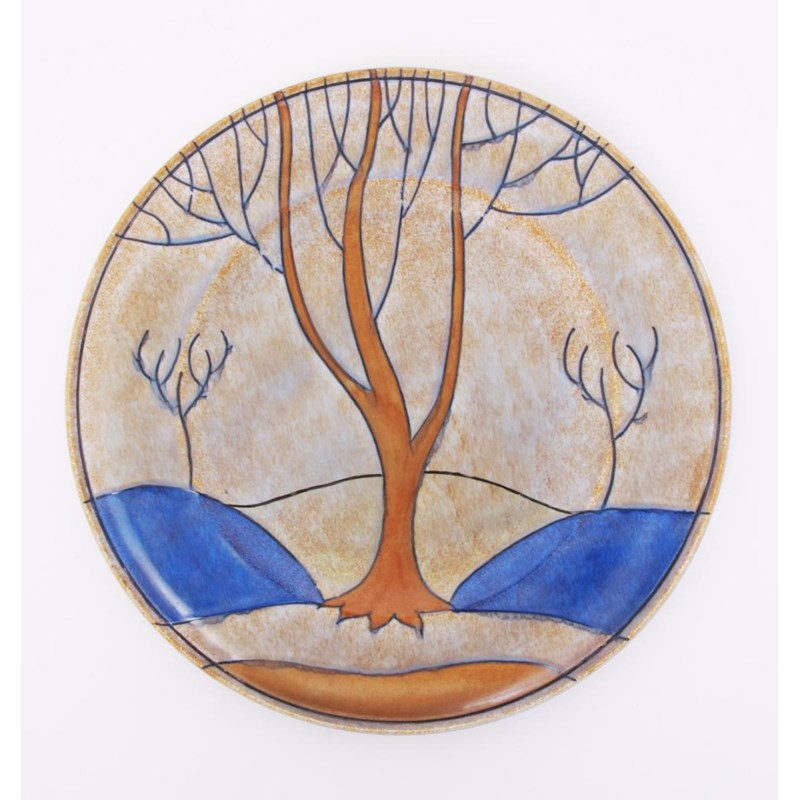 A Burleigh Ware charger by Harold Bennett, tubeline decorated with a tree in a hilly landscape, in shades of brown and blue on a mottled orange ground, printed mark, painted Bennett signature 36cm. diam.