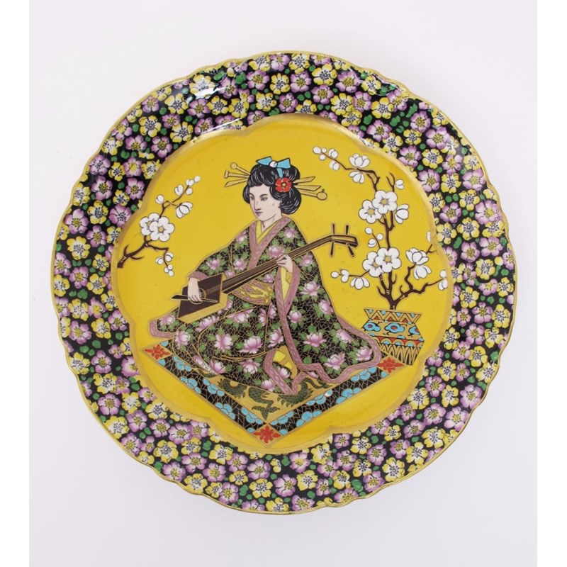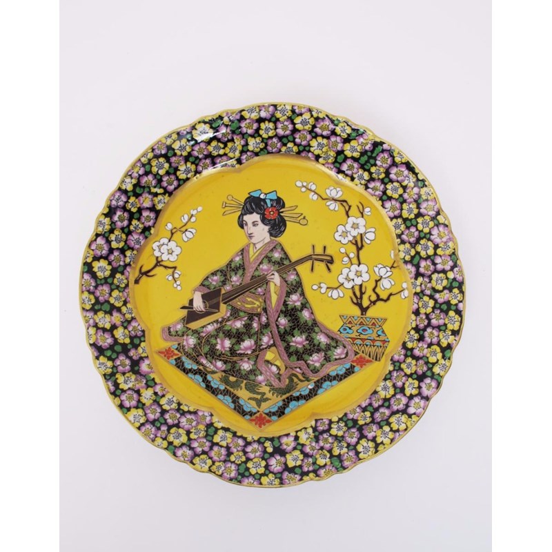 A pottery shallow charger painted with a Geisha playing a musical instrument the design...
