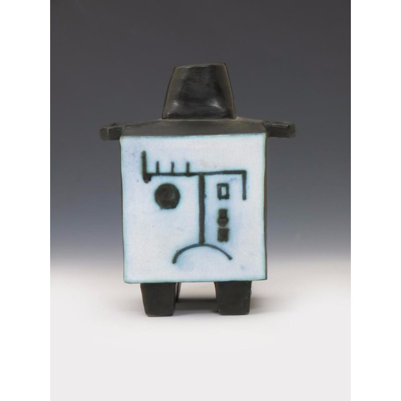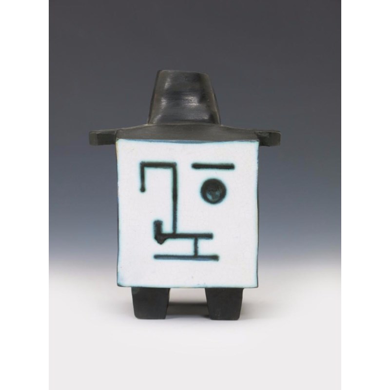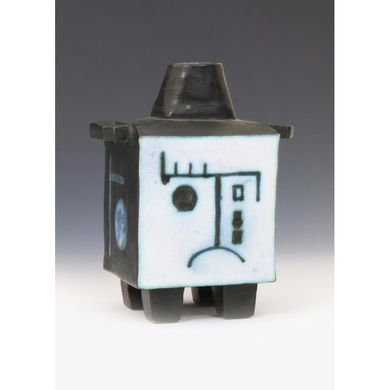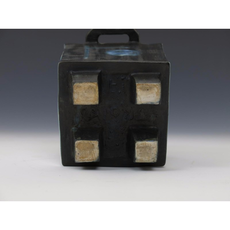 A rare and early Troika Pottery Lidded Cube vase by Leslie Illsley, square section, painted with a smiling cubist face, the reverse with a sad, crying face, in blue/black on a white ground, the feet, shoulders and handles glazed bronze impressed Troika trident motif 15cm. high