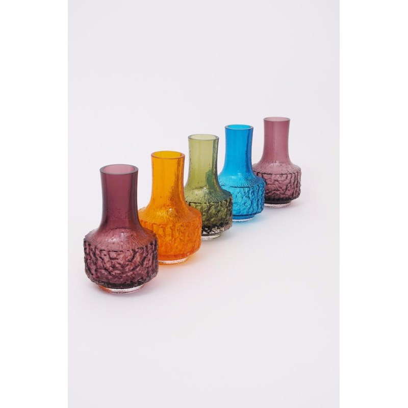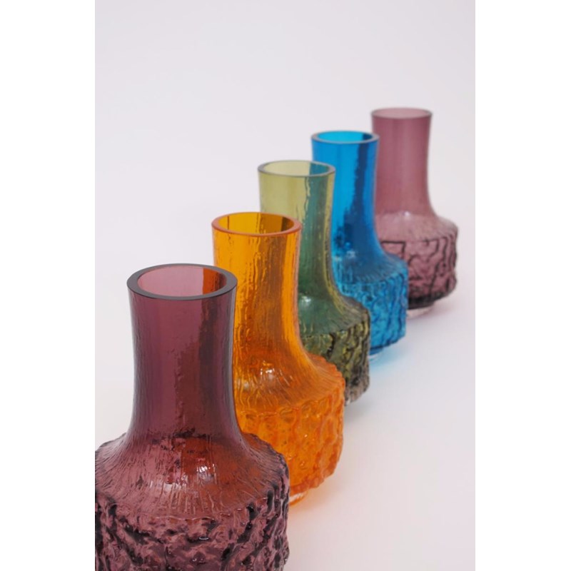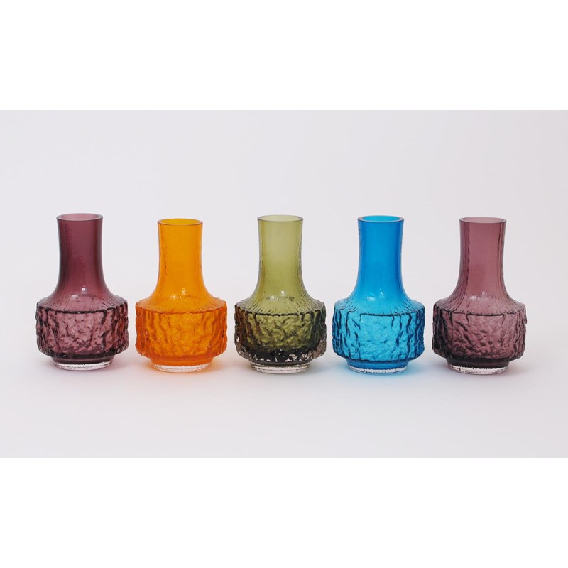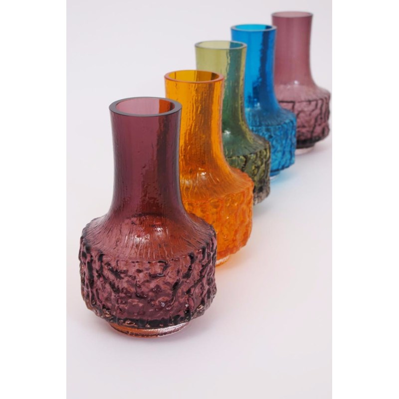 A pair of Whitefriars Aubergine glass Mallet vases designed by Geoffrey Baxter, and three other Whitefriars Mallet vases in Tangerine, Meadow Green and Kingfisher Blue 18cm. high (5)