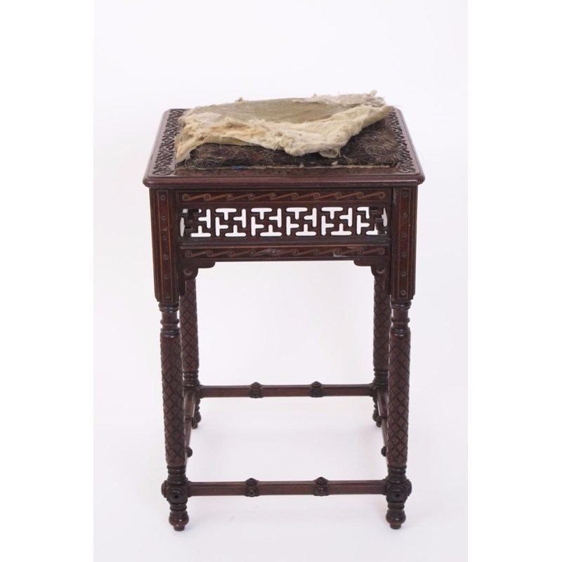 An Arts and Crafts American stool, square section over pierced frieze, on four turned legs with carved trellis design, padded seat 35cm. square, 51cm. high