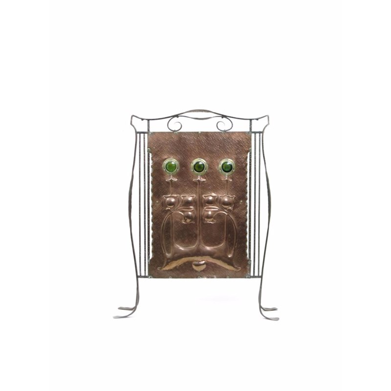 An Arts and Crafts copper and wrought iron firescreen, the rectangular copper panel stamped in low relief with stylised flower stems set with green flower roundels with brass frames, in scrolling patinated iron frame unsigned 85 x 68cm.