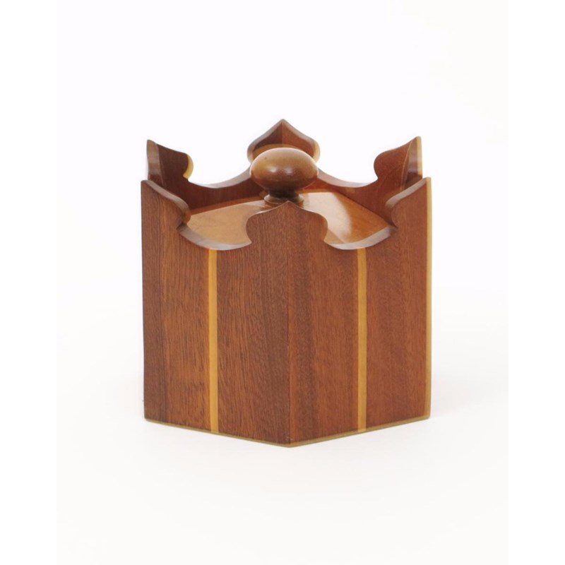 A Cotswold School walnut caddy and cover the design attributed to Hugh Birkett, hexagonal section the caddy formed as a crown, cedar lined unsigned 11cm. high