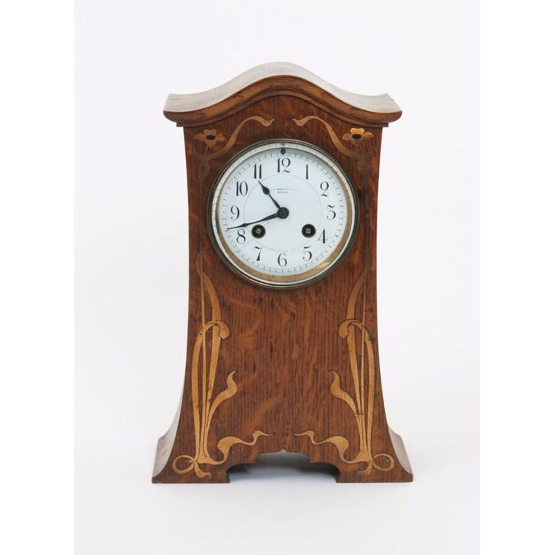 An Arts and Crafts inlaid oak mantel clock