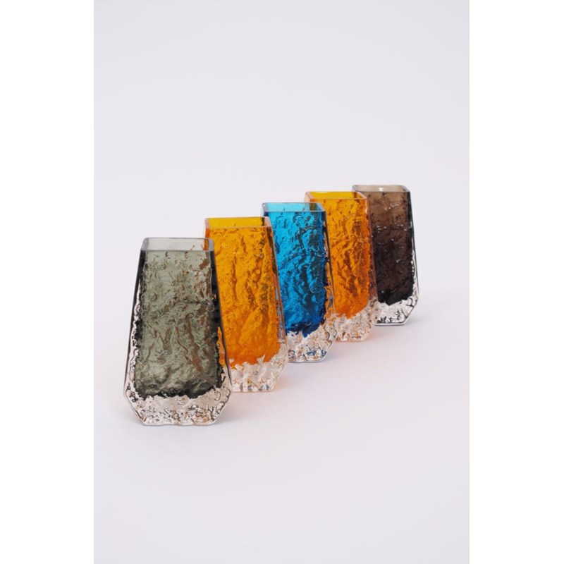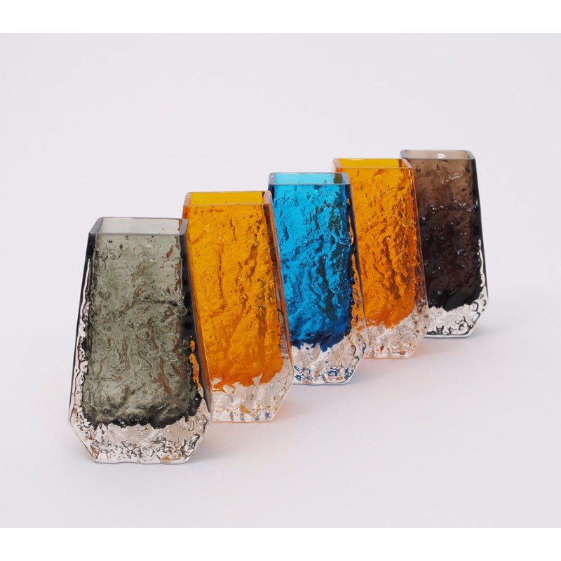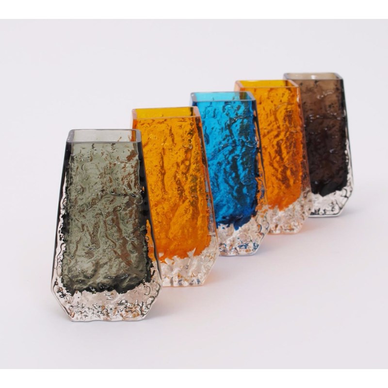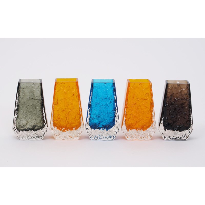 A pair of Whitefriars Tangerine glass Coffin vase designed by Geoffrey Baxter, and three other Whitefriars Coffin vases Kingfisher Blue, Cinnamon and Willow glass 13.5cm. high (5)