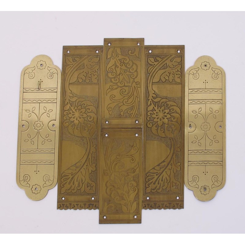 A set of four Aesthetic Movement polished brass door plates, in the manner of Dr Christopher Dresser, cast with stylised flower and scrolling foliage designs, four others similar and four smaller door plates one stamped B to reverse, 27.5cm. long (12)