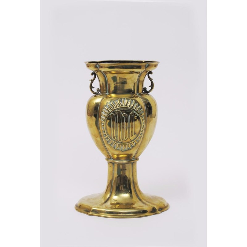 A Gothic Revival cast brass vase, the swollen, ribbed body cast with a sun motif, unmarked 29cm. high