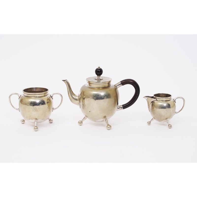 A Hukin & Heath electroplated three piece tea set in the manner of Dr Christopher Dresser, model no.2077, the ovoid body with tripod ball feet, ebonised wood handle and finial to the tea pot, each piece incised with a unicorn crest stamped marks, 12cm. high (3)