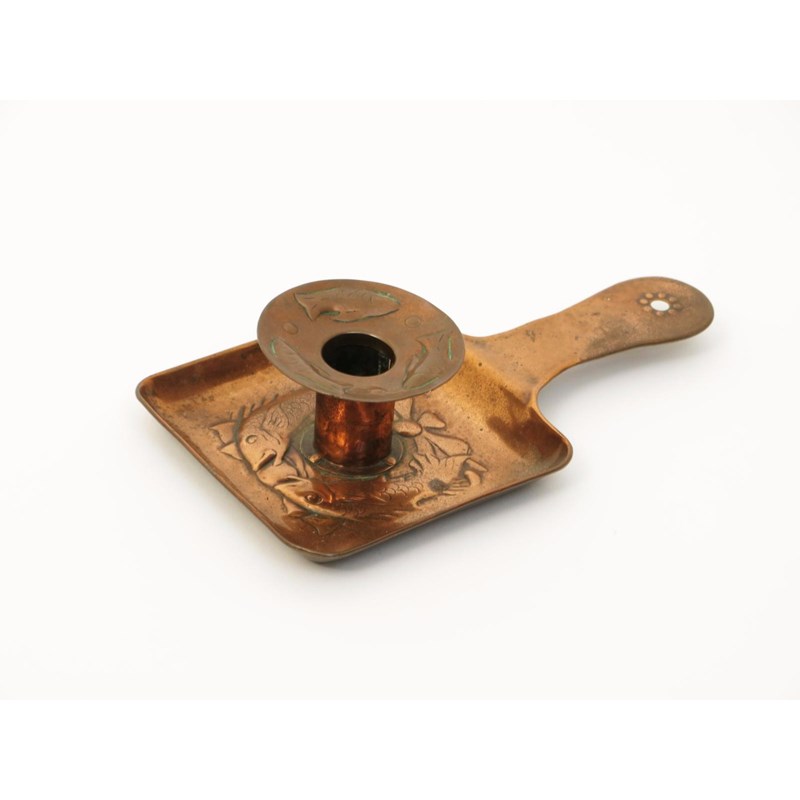 A Newlyn Industrial Classes copper chamberstick, the square section tray and circular sconce hammered in relief with scaly fish, stamped Newlyn 21cm. long