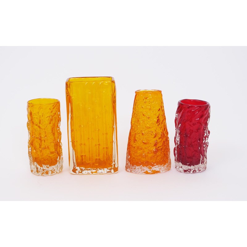A Whitefriars Tangerine glass Bamboo vase designed by Geoffrey Baxter, two other Whitefriars Tangerine glass vases and a Whitefriars Ruby glass Bark vase 20cm. high (4)