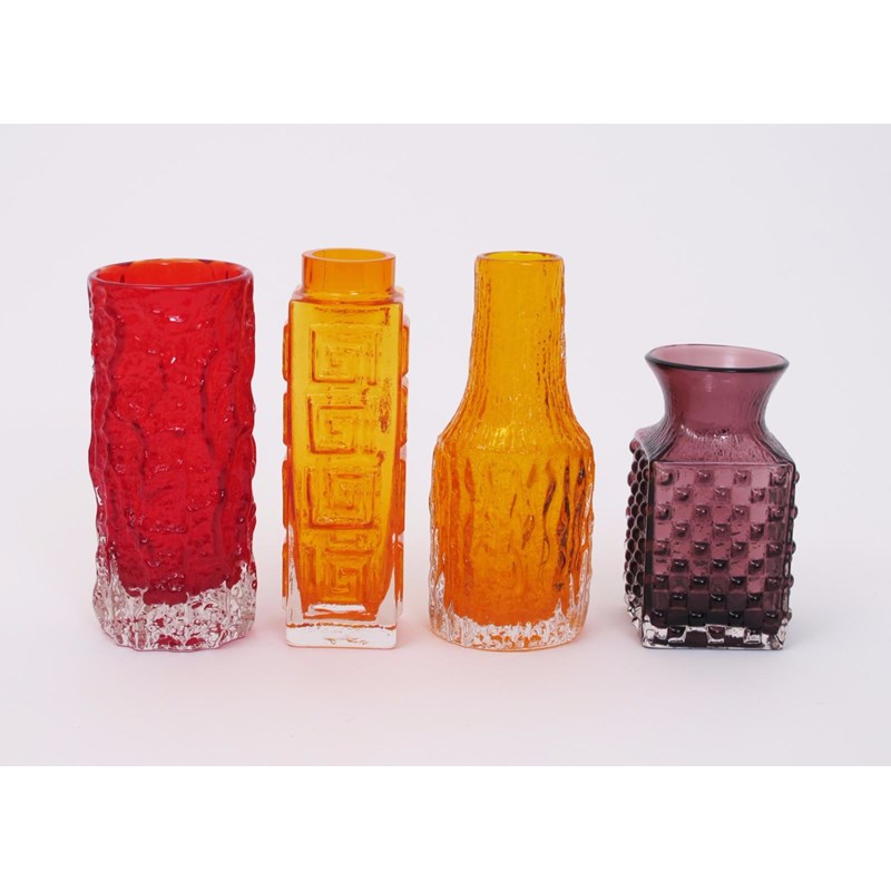 A Whitefriars Tangerine glass Greek Key vase designed by Geoffrey Baxter, a Whitefriars Tangerine Shouldered vase, a Whitefriars Aubergine Chess Board vase and a Ruby Bark vase 20cm. high (4)