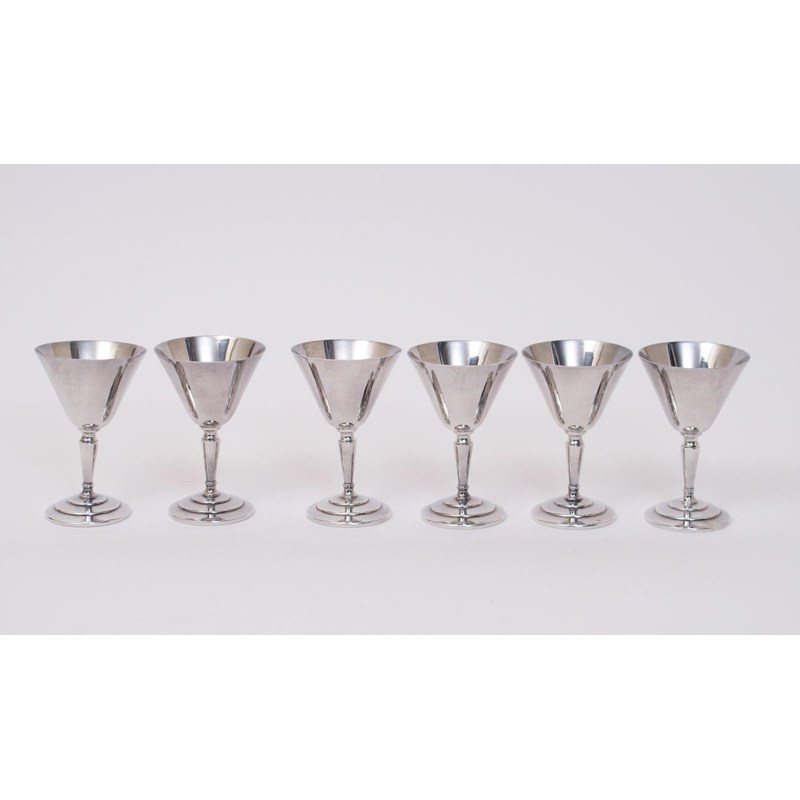 A set of six Mappin & Webb electroplated cocktail glasses designed by Keith Murray, model no.W.28084, n stepped circular base, the flaring Conical stem supporting flaring conical bowl, stamped marks to base 11.5cm. high (6)
