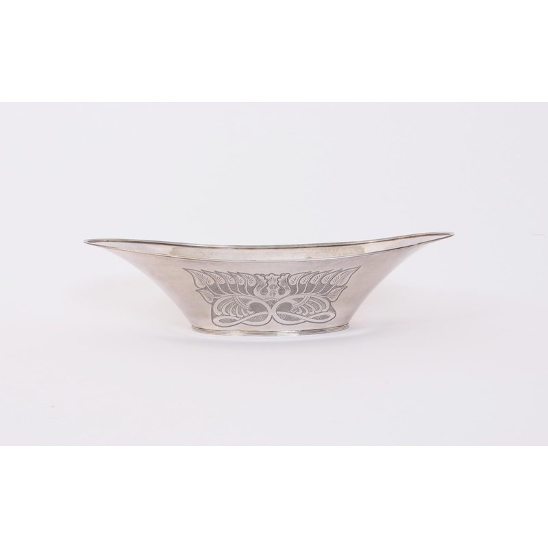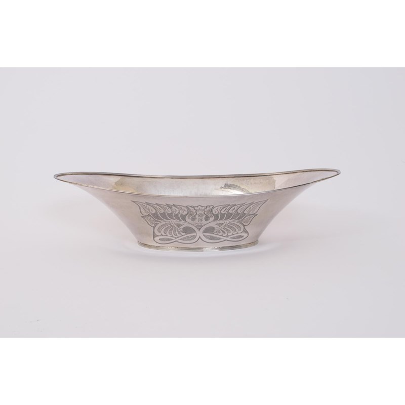A Falcon Works silver fruit bowl by H.G. Murphy, flaring elliptical section, with reeded foot and rim, the side engraved with a panel of a tulip flower amidst scrolling foliage stamped marks, London 1936 37.5cm. wide, 9cm. high
