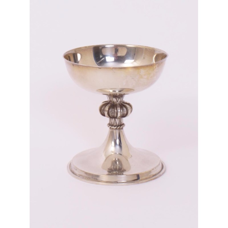 An A E Jones silver chalice, model no.1254, the tapering cylindrical foot supporting reeded knop and flaring bowl, the knop with chased decoration stamped A E J mark, Birmingham 10.5cm. high