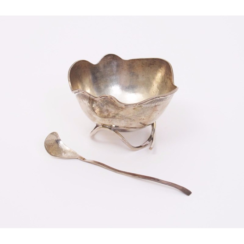 A silver bowl and serving spoon by Patricia Gould