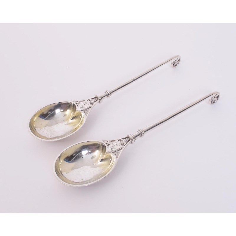 A pair of silver spoons in the manner of William Burges, the pierced shoulder with fleur de lys and shield motif engraved NM monogram, long tapering stem with scrolled leaf terminal, stamped marks, London 1885, 21cm. long.