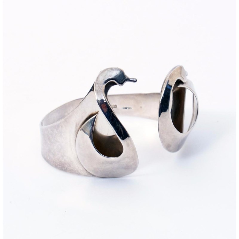 A Lapponia silver bangle, the graduated curved band applied with a pair of courting swans, with original silver fabric drawstring pouch stamped marks, 6.5cn wide.