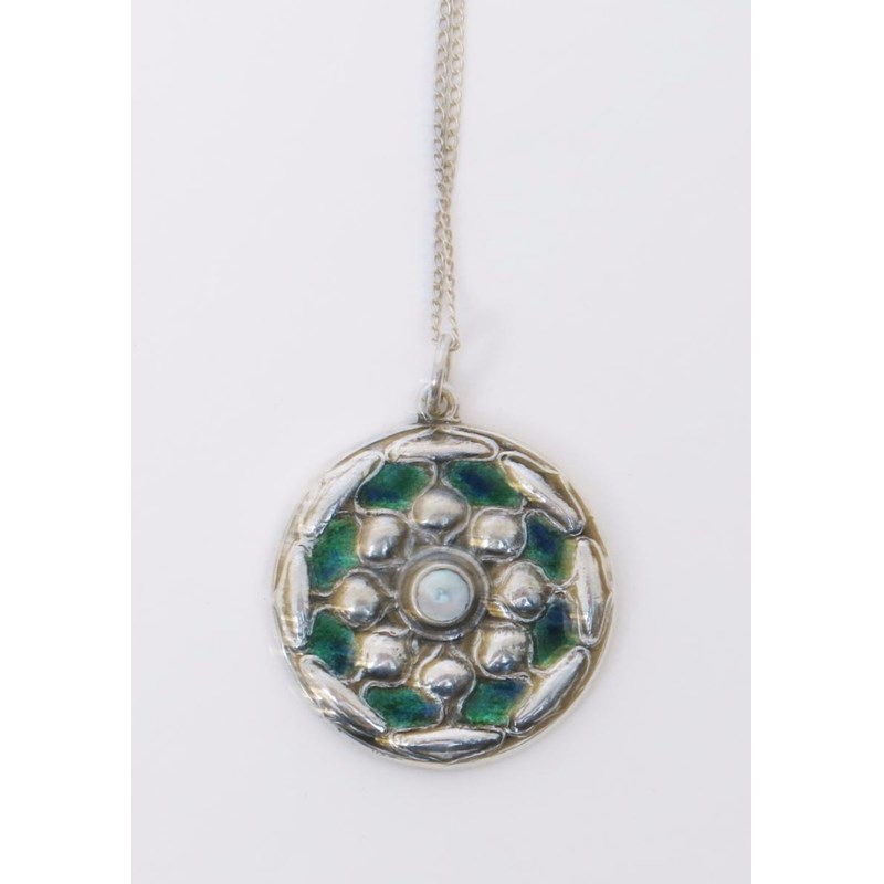 A Liberty & Co Cymric silver and enamel pendant, circular cast in low relief with stylised flowerhead, set with abalone shell centre, enamelled green and blue, on later chain stamped Cymric Liberty hallmark, Birmingham 1903 3.3cm. diam.