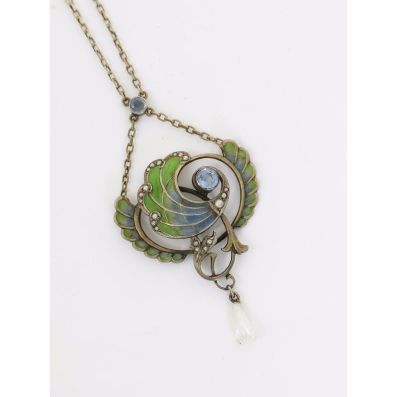 An Art Nouveau silver and plique a jour enamel pendant necklace by Carl Herman, pierced wirework frame of scrolling foliage with green and blue enamel cells, set with topaz stones, with blister pearl drop stamped marks, 5cm. long