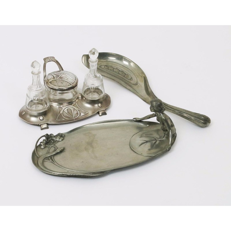 An Art Nouveau W.M.F. pewter tray, cast in relief with a figure rising from a lily pad, a serpent on the rim, a W.M.F cruet tray with glass bottles, two pewter dishes and an English Pewter Art Nouveau crumb scoop probably retailed by Liberty & Co stamped marks, 24.5cm. wide