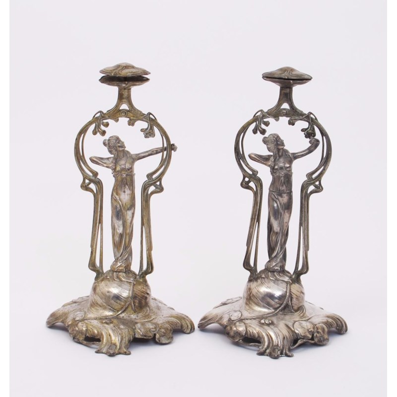 A pair of W.M.F electroplated tazza bases, each modelled with an Art Nouveau maiden rising from a domed turbulent base with berried foliage sprays stamped marks, glass bowls missing 33.5cm. high