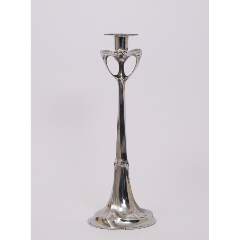 A tall Kayserzinn polished pewter candlestick, amorphic form, with flaring drip pan and sconce, cast mark, 42cm. high