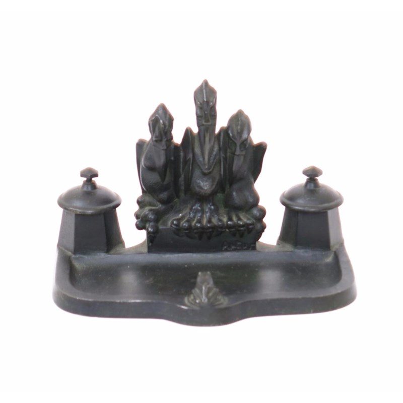 An Artus patinated metal double inkwell and pen tray cast from a model by Max Le Verrier