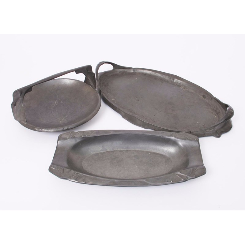 An Art Nouveau Kayserzinn pewter watering can designed by Albin Muller, with slender spout and over-slung handle, cast in low relief with scaly fish, and three Art Nouveau Kayserzinn trays cast marks, 22cm. high (4)