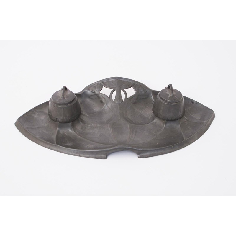 Four W.M.F Secessionist candlesticks designed by Albin Muller, each on diamond shaped foot, cast in low relief with foliate roundel, and an Osiris pewter double inkwell and pen tray candlesticks unmarked, candlesticks 22cm. high, inkwell 36cm. wide (5)