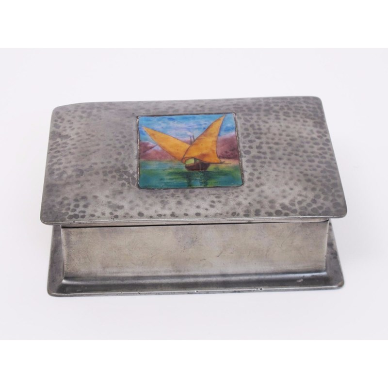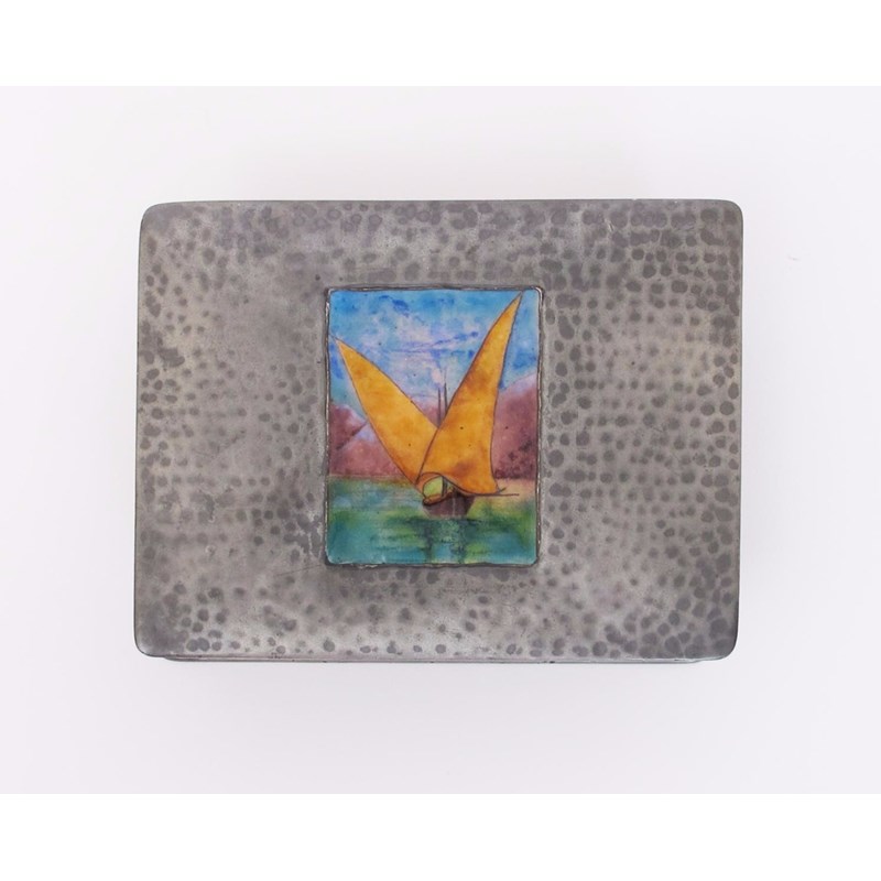 A Liberty & Co pewter box with enamel panel by Charles Fleetwood Varley, the hinged cover, with hammered finish, set with enamel panel of a fishing boat at full sail, cedar lined, stamped 083 16.5cm. wide