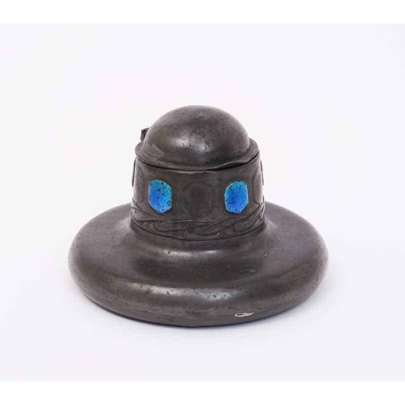 A Liberty & Co Tudric pewter and enamel inkwell designed by Archibald Knox