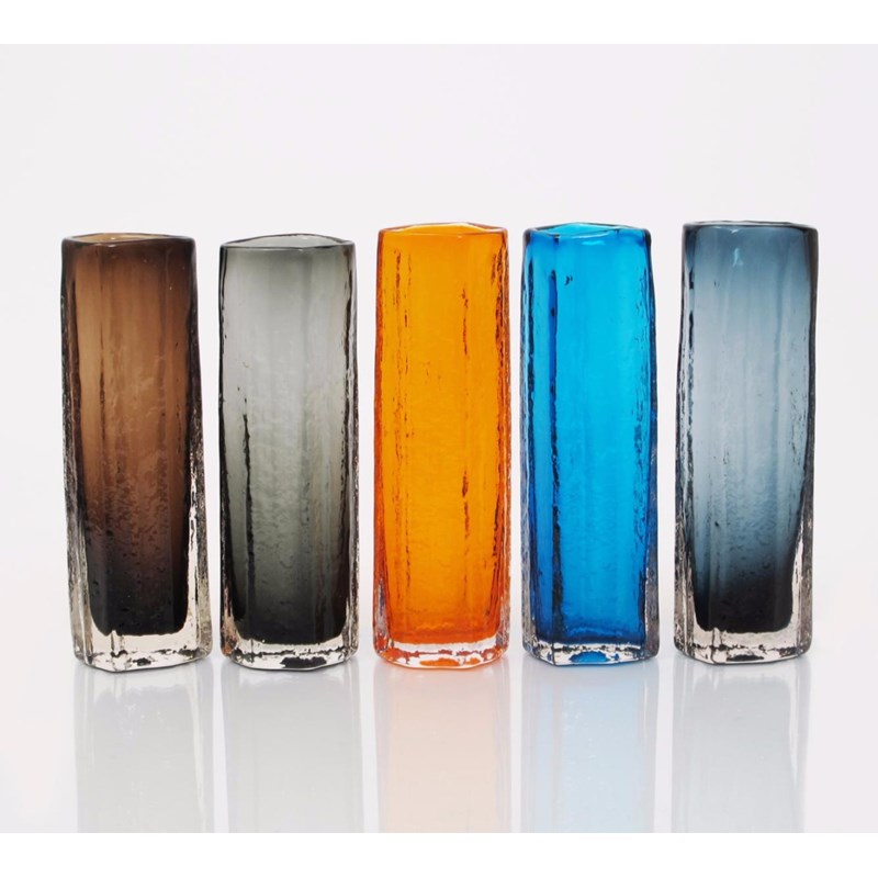 Five Whitefriars glass Cucumber vases designed by Geoffrey Baxter, comprising Tangerine, Kingfisher Blue, Cinnamon, Willow and Indigo, 29.5cm. high (5)