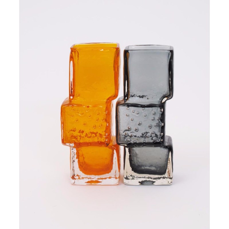 A Whitefriars Tangerine glass Drunken Bricklayer vase designed by Geoffrey Baxter, and a Whitefriars Pewter glass Drunken Bricklayer vase 21cm. high (2)