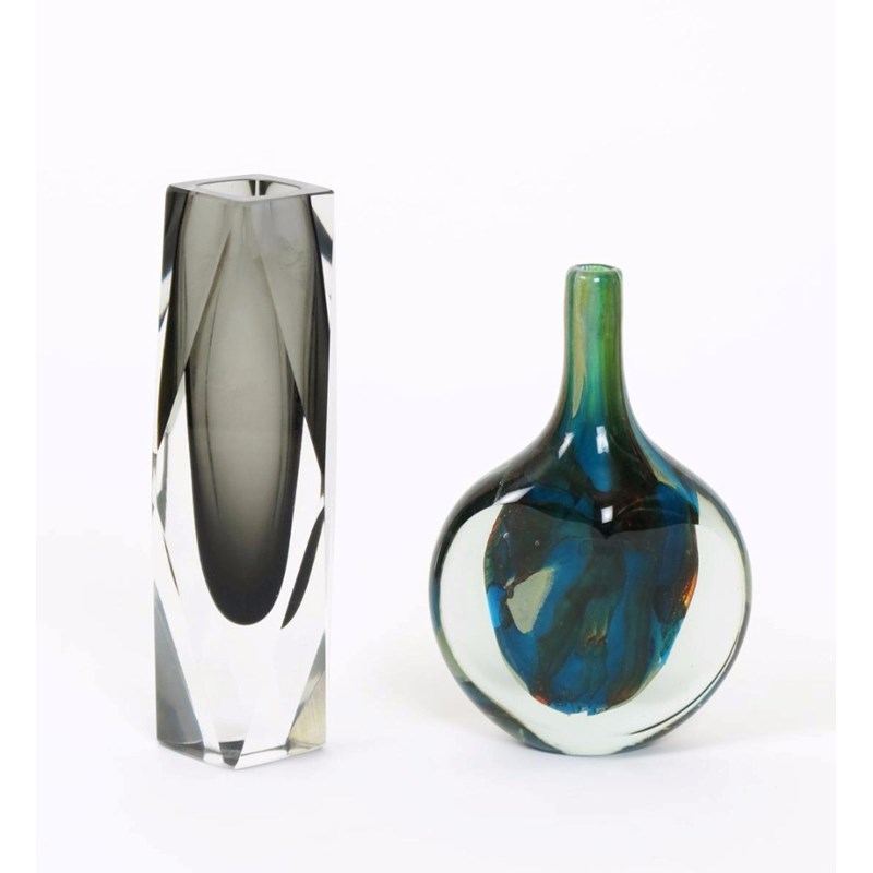 A Mdina glass Cut-Ice Lollipop vase, faceted circular body with tall solifleur neck, mottled blue and amber cased in clear, and a faceted glass Sommerso vase etched Mdina 18cm. high (2)