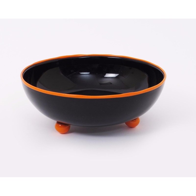 A Loetz glass footed bowl designed by Michael Powolny, the black glass body with applied orange rim and three ball feet remains of retailers paper label 21cm. diam.