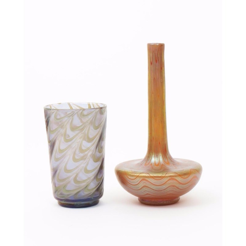A Loetz iridescent glass solifleur vase, compressed body with tall cylindrical neck, covered in a Phanomen combed golden iridescence over orange, and another glass vase in the manner of Loetz, unsigned 25.5cm. high (2)