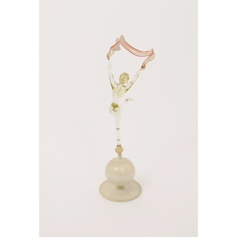 A Bimini Werkstatte glass figure of a scarf dancer, the clear glass figure modelled balancing on one foot her arms raised and holding a red and white striped scarf billowing in the wind, on opaque glass globe and flaring foot unsigned 31cm. high