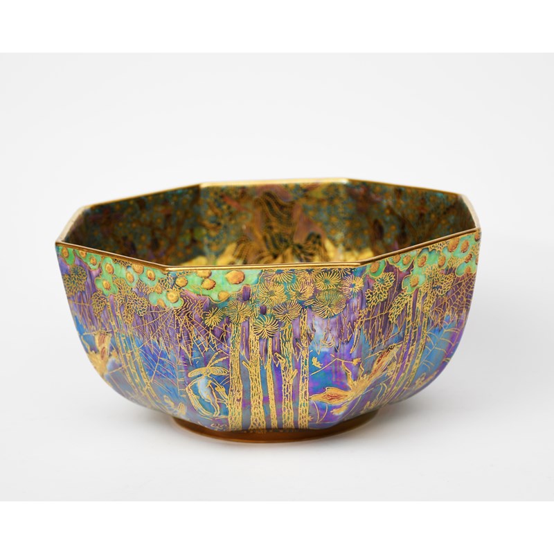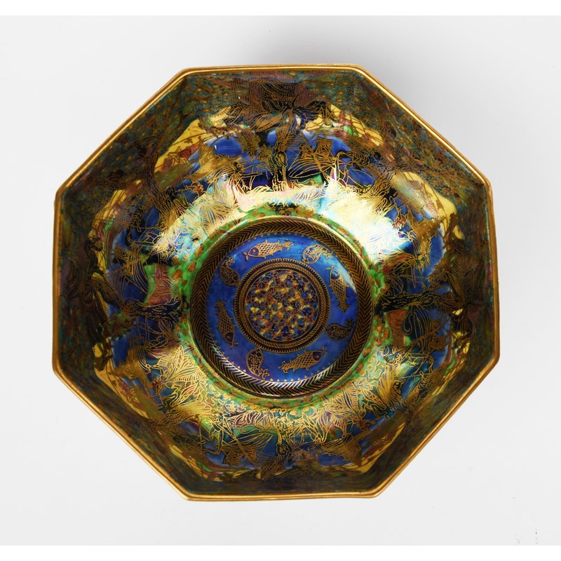 'Moonlight Fairyland' a Wedgwood Pottery Fairyland lustre Octagon bowl designed by Daisy Makeig-Jones, pattern no.Z.5462, printed and painted in colours and gilt on a royal blue lustre ground, the interior 'Jumping Faun' pattern printed and painted factory marks, bowl rivetted, 20cm. diam.