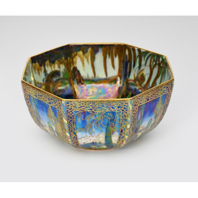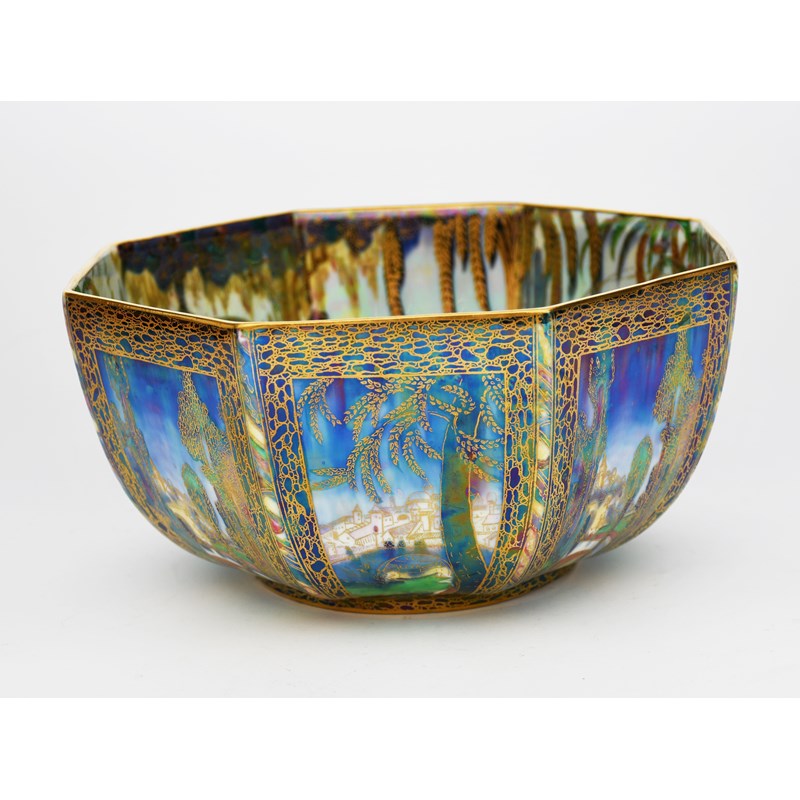 'Castle on a Road' a Wedgwood Fairyland lustre Octagon bowl designed by Daisy Makeig-Jones, pattern no. Z5128, printed and painted in colours and gilt to the exterior on a blue lustre ground, the interior 'Fairy in a Cage' on a pearl lustre ground, printed and painted factory marks, 22.5cm. diam.